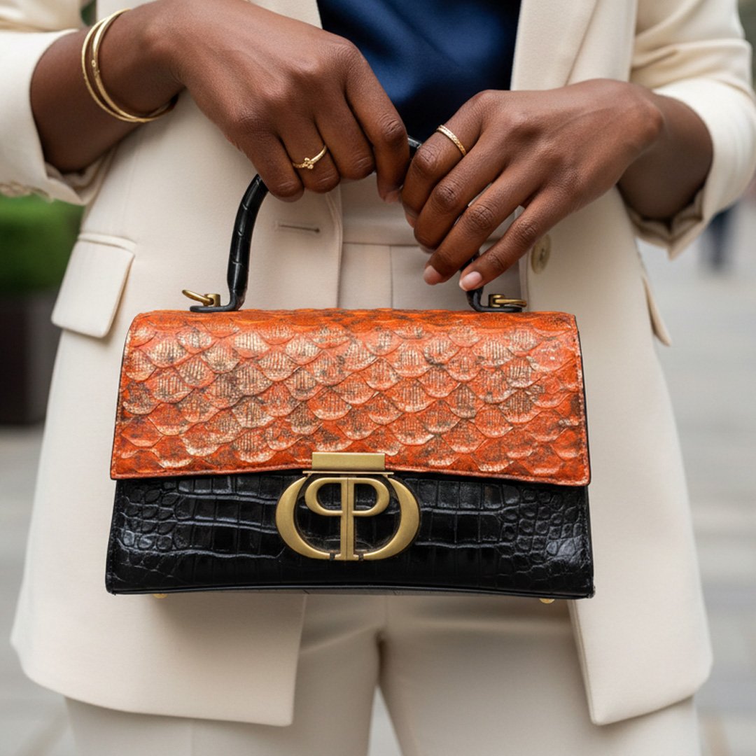 Bold black and orange crocodile-effect bag with a unique textured flap and gold hardware.