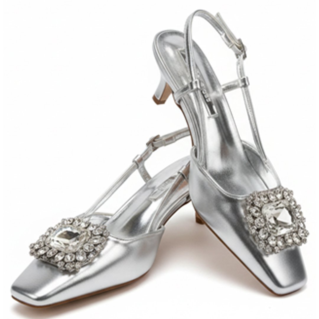 Shine brighter than the spotlight in this breathtaking metallic silver slingback. The sophisticated square toe and low, comfortable heel are secondary to the stunning focal point: a large, multi-faceted crystal embellishment that catches the light with every step.
